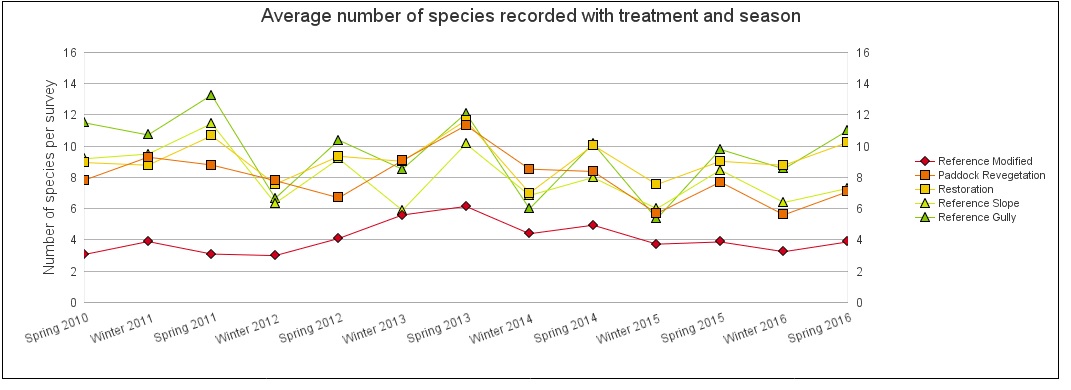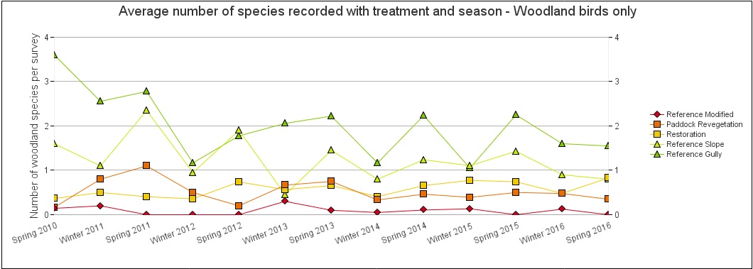 Thanks to Cara Byrt, our monitoring database expert, we have this fantastic graph, that charts the average number of species recorded across the seasons, in various habitats. This graph shows us that woodland birds clearly prefer the fertile gullies and river red gum flats that are in our ‘intact’ areas – areas such as Muckleford Nature Conservation Reserve, or private land such as Andrew Skeoch and Sarah Koschak’s woodland property. More woodland bird species are recorded in this habitat type than any other. This supports the fantastic research undertaken by our great supporter and technical advisor to our monitoring programs, Prof. Andrew Bennett. See here for a summary of this fascinating research.